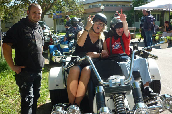 Als die 12 Trike-Fahrer auf dem Gelände eintrafen, brach großer Jubel aus. Und jetzt hieß es, sich möglichst vorne in die Warteschlange einzureihen, damit man gleich bei der ersten Ausfahrt mit dabei sein konnte. Helm auf, anschnallen und los ging die rund 20-minütige Fahrt rund um Tettnang. So manch einer stellte sich nach der Ankunft gleich wieder in die Schlange, um noch einmal den Fahrtwind zu spüren und die Geschwindigkeit zu genießen.