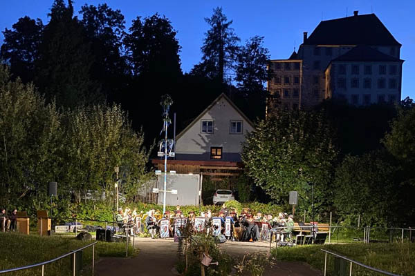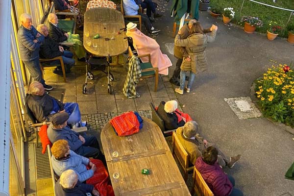 Eine Stunde lang gab die Kapelle ihr Repertoire zum Besten. Die Konzertorte wechseln durch die Gemeinde und erfreuen sich bei den Bürgerinnen und Bürgern immer großer Beliebtheit, dieses Mal fand das Konzert beim Haus der Pflege St. Dominikus statt.