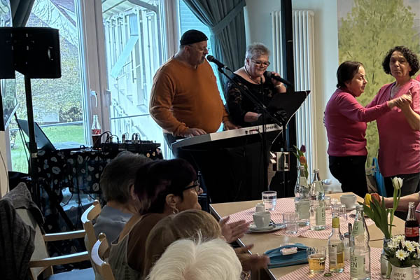 Unter den Gästen befanden sich auch die Sozialstation St. Franziskus sowie die Wohnanlage Graf Eitel-Friedrich. Die Gruppe trat mit Pompons auf und brachte damit eine zusätzliche Dynamik in den Saal. Für die musikalische Gestaltung sorgte Sängerin „Silke-Pur“. Silke Flemming und ihr Mann Marcel präsentierten ein breites Repertoire, das viele Besucherinnen und Besucher zum Mitsingen und Tanzen motivierte.