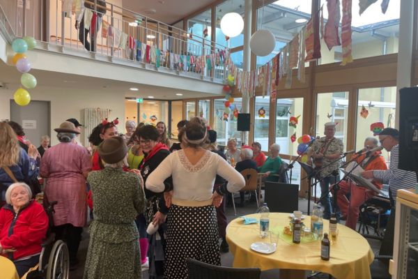 Die hauseigene Band sorgte mit ihrem großen Repertoire an Schlagern und Faschingshits für gute Laune und lud die Anwesenden zum Singen, Schunkeln und Klatschen ein. Schnell füllte sich der Raum mit ausgelassener Stimmung und so mancher Gast ließ es sich nicht nehmen, das Tanzbein zu schwingen. Das kostümierte Team des Haus der Pflege St. Gebhard sorgte zusätzlich für eine fröhliche Atmosphäre.